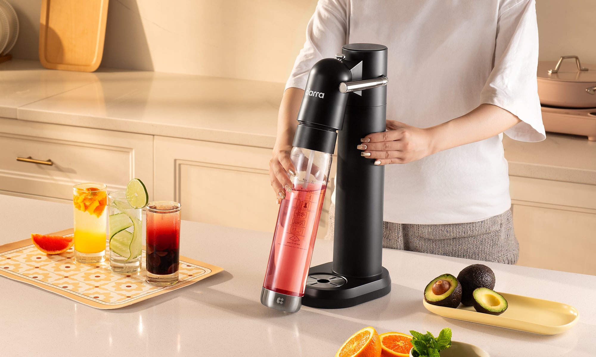 ติมน้ำเย็นลงในขวดแล้วใส่เข้าไปในระบบล็อคเร็ว ดันขวดขึ้นตรงเข้าหาตัวเครื่อง กดปุ่มทำน้ำโซดา 2-3 ครั้งจนได้ยินเสียงฟู่ จากนั้นกดอีกครั้งเพื่อเลือกระดับความซ่าตามที่คุณต้องการ