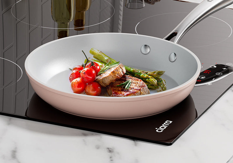 La collection d'ustensiles de cuisine antiadhésifs à induction collabore parfaitement avec toutes les plaques de cuisson à induction, formant un duo impeccable qui fonctionne en douceur et émet un minimum de bruit.