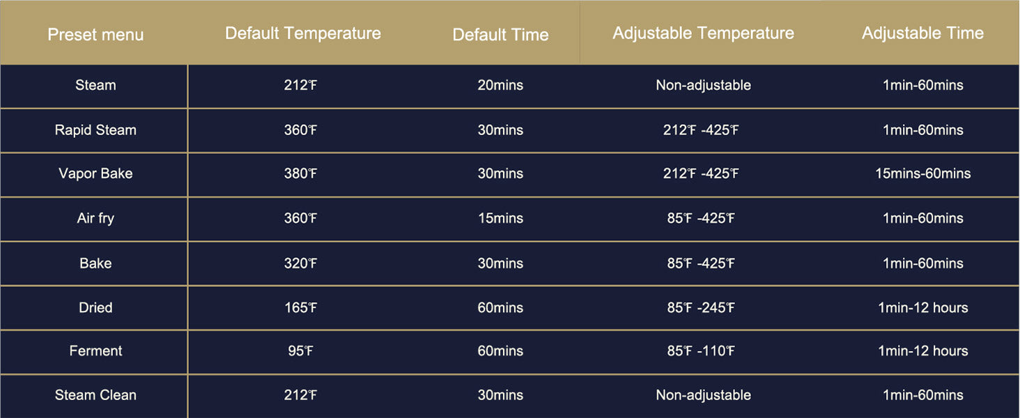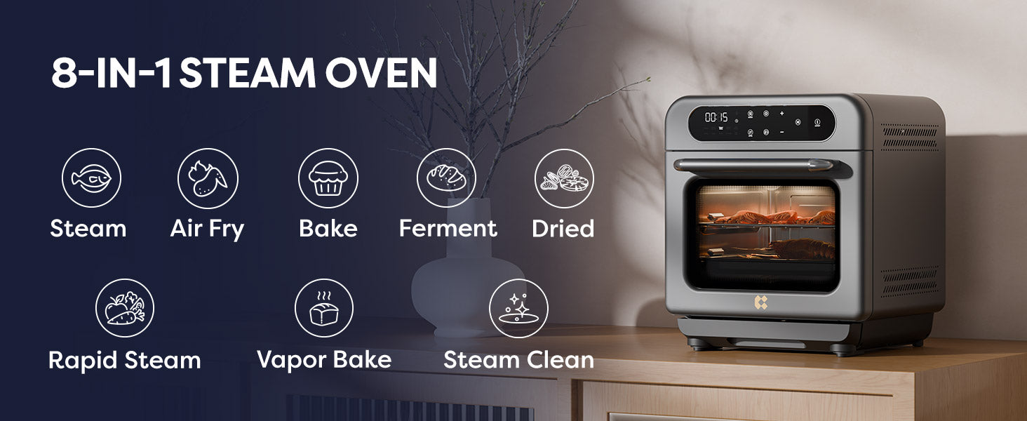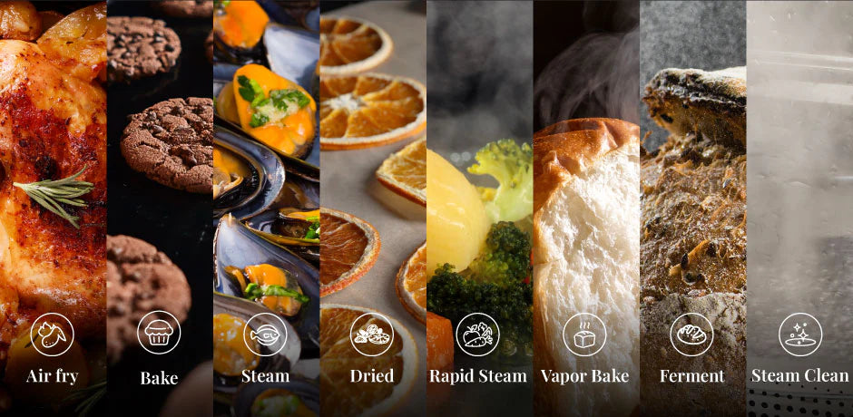 8 in 1, Steam, Rapid Steam, Vapor Bake, Air fry, Bake, Dried, Ferment, Steam Clean