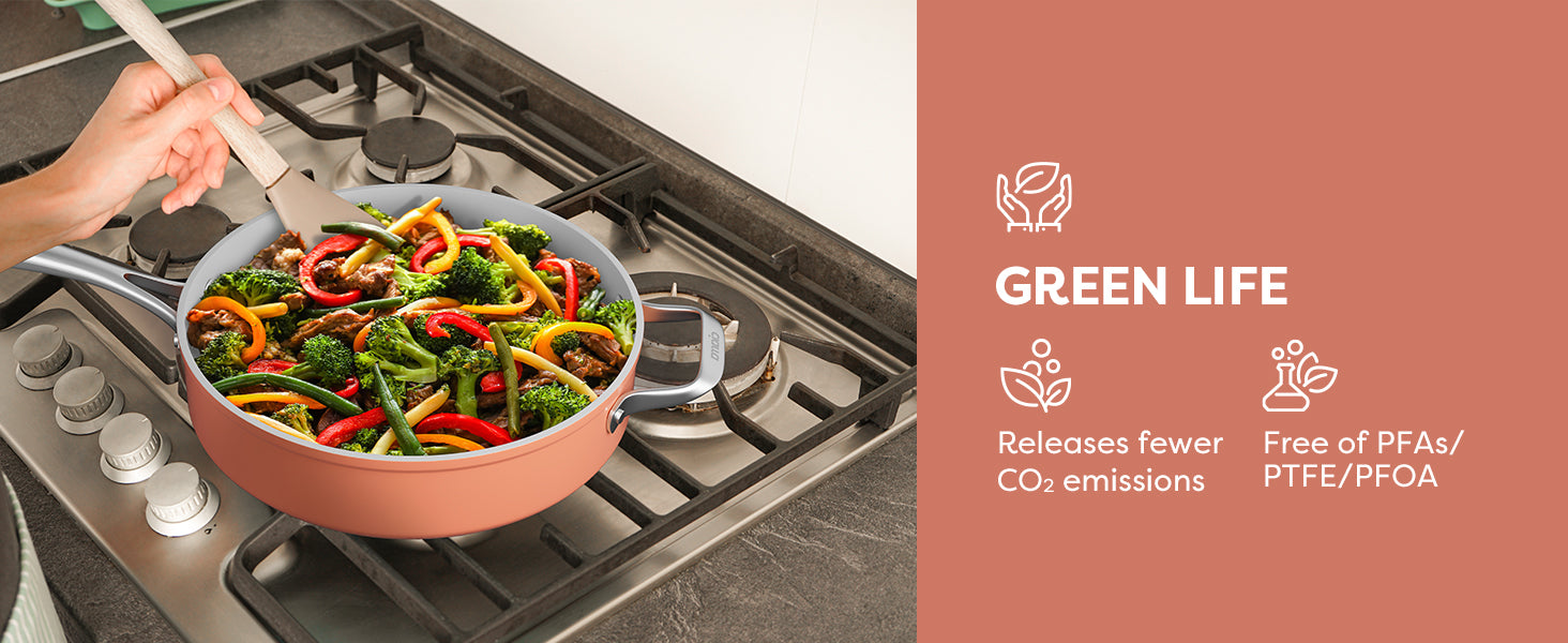 Induction nonstick cookware collection seamlessly collaborates with any induction cooktops, forming an impeccable duo that operates smoothly and emits minimal noise.