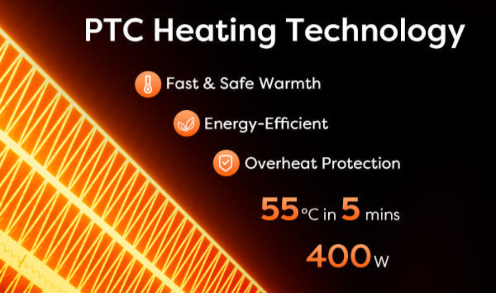 ThePTC ceramic heating techdelivers targeted warmth in seconds, reaching up to 55°C output efficiently.