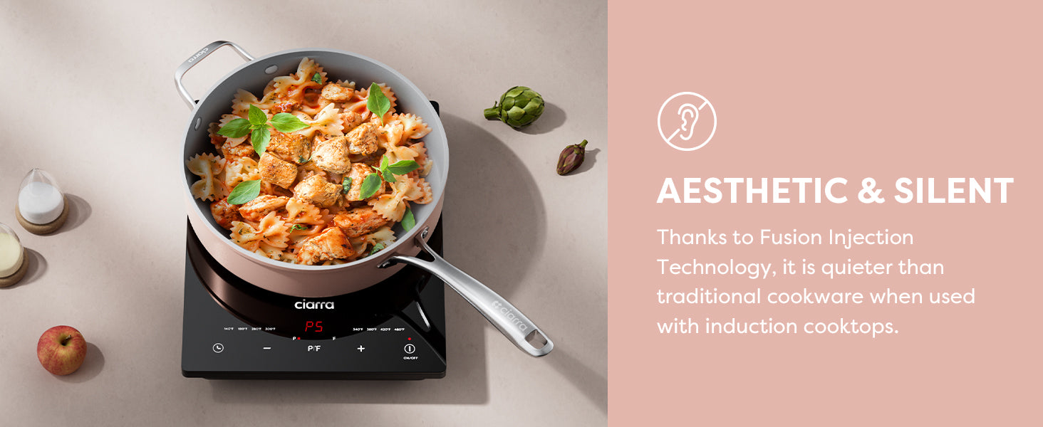 Induction nonstick cookware collection seamlessly collaborates with any induction cooktops, forming an impeccable duo that operates smoothly and emits minimal noise.