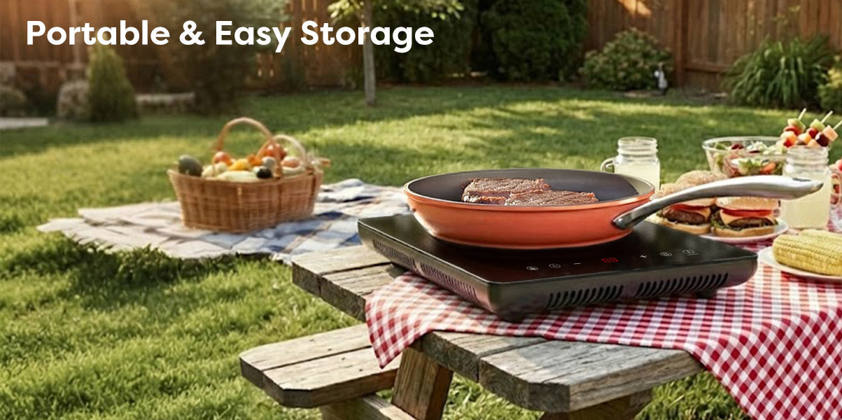 Practical and portable, this 2000W single plate induction hob features a BOOST function for fast cooking, 9 power levels, a 99-minute timer, and safety protections. Compact and lightweight, it’s perfect for home, travel, or outdoor use.