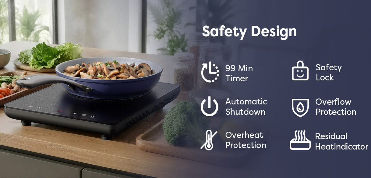 Equipped with child lock, overheating protection, and residual heat warning, this induction hob ensures safe operation for every household. The automatic shut-off and high-temperature alerts prevent accidents, giving you peace of mind while cooking.
