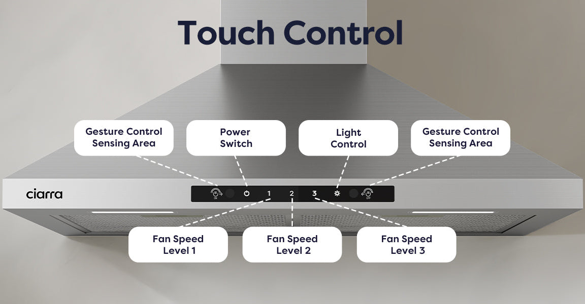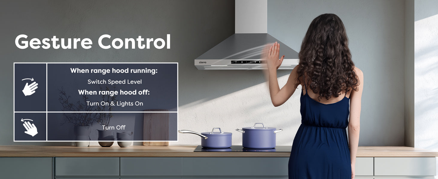 This range hood pairs intuitive touch controls with advanced gesture sensing for effortless operation in any cooking situation. Control power and lighting via the touch panel, or simply wave your hand to turn the hood on/off and adjust fan speeds—making your kitchen cleaner, smarter, and more convenient than ever.