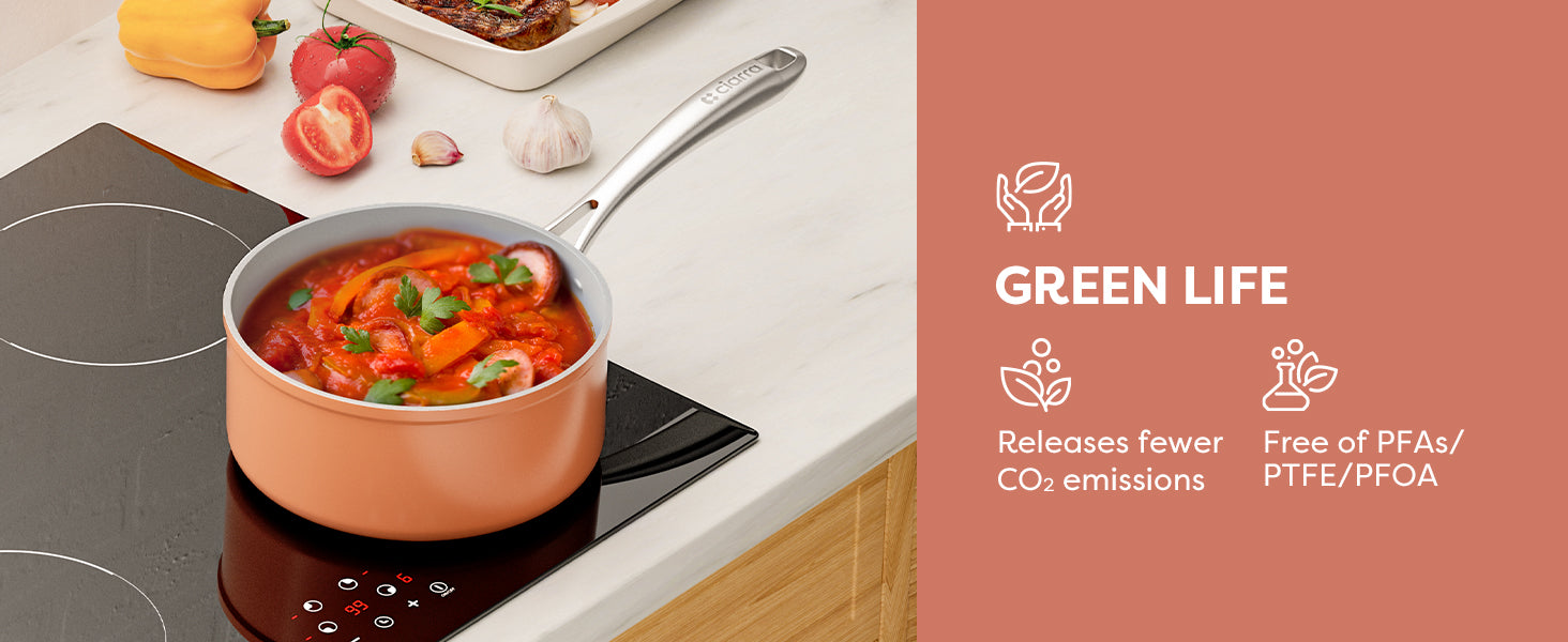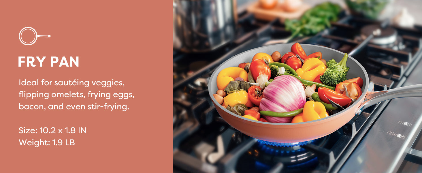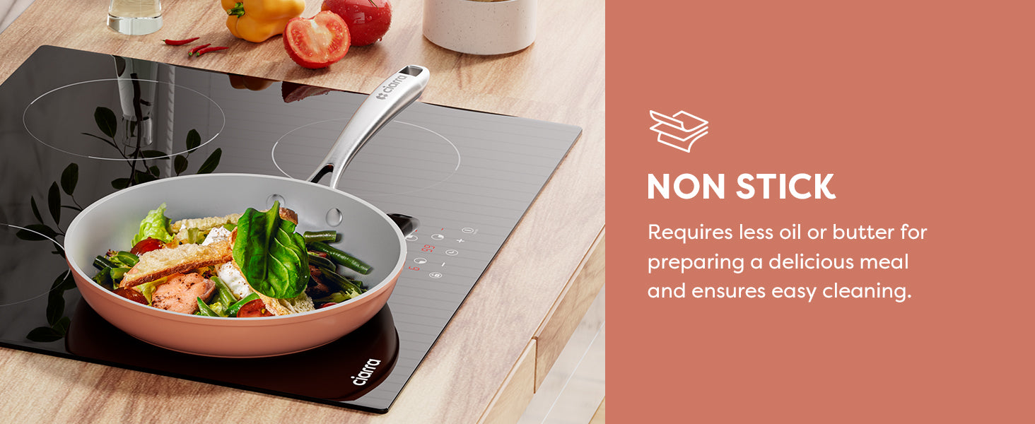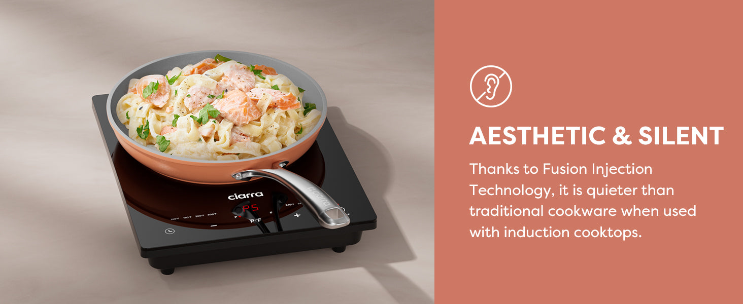 Induction nonstick cookware collection seamlessly collaborates with any induction cooktops, forming an impeccable duo that operates smoothly and emits minimal noise.